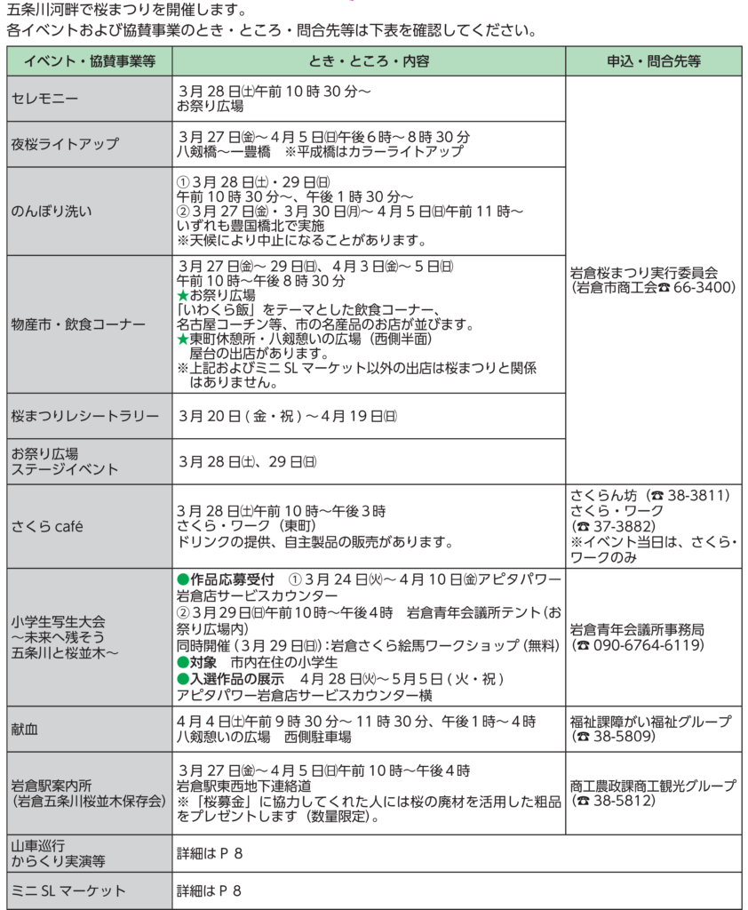 令和8年3月27日(金)~4月5日(日)までの桜まつり開催期間中は、原則臨時駐車場の設置はいたしません。ただし、八剱憩いの広場の一部を事前予約制の駐車場とする予定です。岩倉市内及び周辺の道路が大変混雑することが予想されます。ご来場の際は、公共交通機関等をご利用ください。