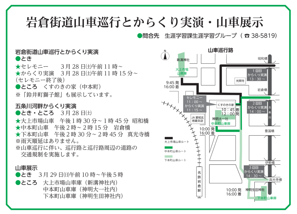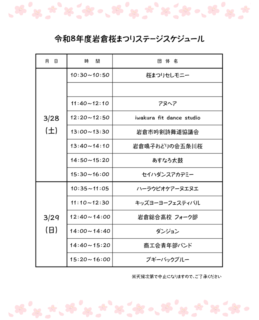 令和8年3月27日(金)~4月5日(日)までの桜まつり開催期間中は、原則臨時駐車場の設置はいたしません。ただし、八剱憩いの広場の一部を事前予約制の駐車場とする予定です。岩倉市内及び周辺の道路が大変混雑することが予想されます。ご来場の際は、公共交通機関等をご利用ください。